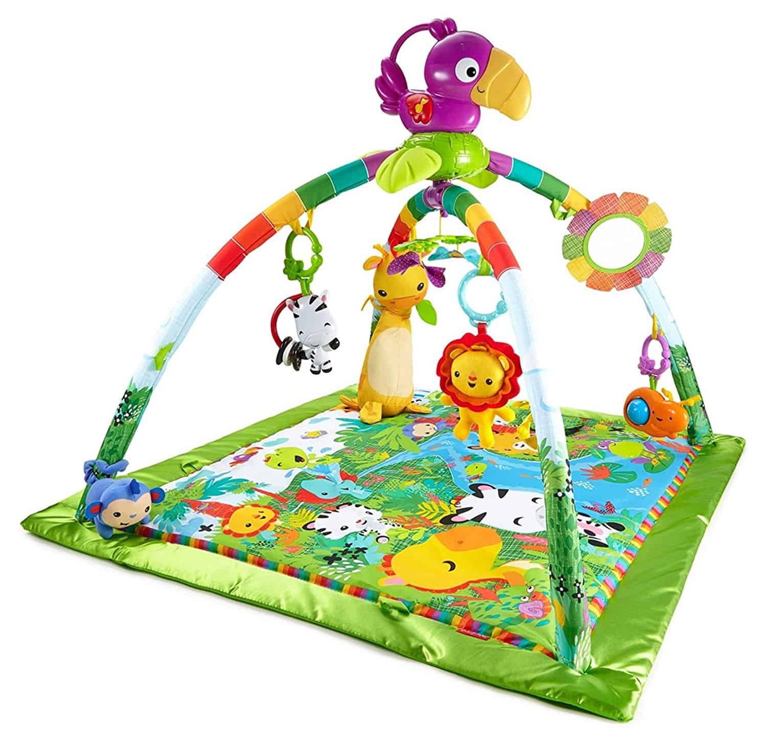 Fisher price rainforest music lights deluxe gym amazon exclusive with a third play setting and more than 10 toys activities the fisher price rainforest music lights deluxe gym keeps baby busy as a bee at home or on the go.