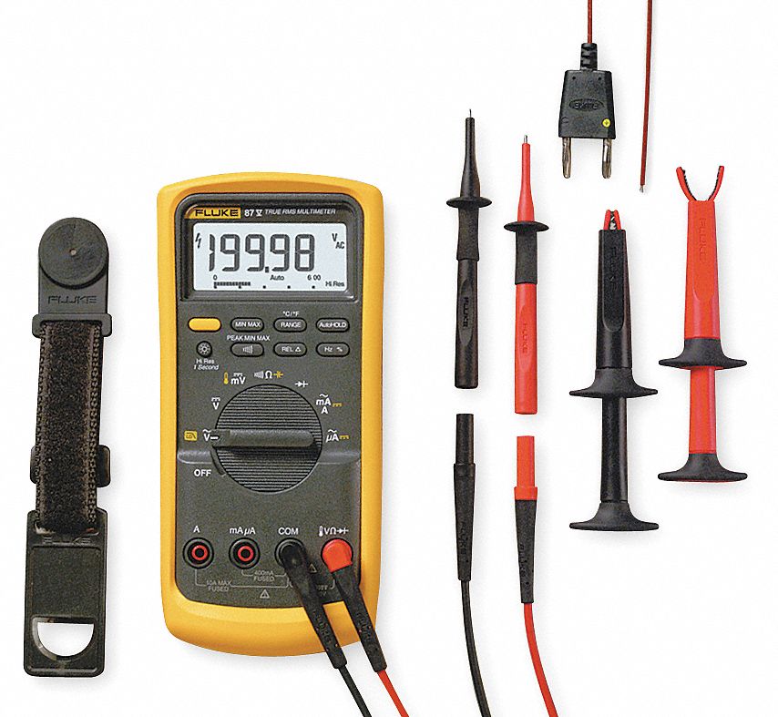 Fluke 87v e2 industrial electrician combo kit and nist certificate fluke 87v industrial multimeter heavy duty test leads alligator clips test probes strap and case this combo kit is built around the fluke 87v the most widely used industrial digital multimeter in the world and includes special accessories to make you even more productive.